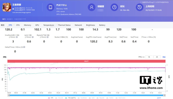 首先是负载较低的《王者荣耀》,一加15应对这种压力的手游非常轻松,Perfdog(性能狗)直接一条直线,游戏平均帧数120帧,连1%Low帧都在100帧以上,游戏体验极佳。