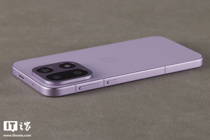 相比之下,我们拿到的另一款「雾光紫」配色,采用的是「双维流光工艺」,通过玻璃折射的光学原理,在后盖周围做了一道蓝色的“光轨亮边”,光线下会闪烁出荧光蓝的光泽,中间的部分就是非常纯净,质感强烈的紫色丝绒玻璃,一加Logo也改为了透明处理,相比「原色沙丘」配色,更加活泼灵动。