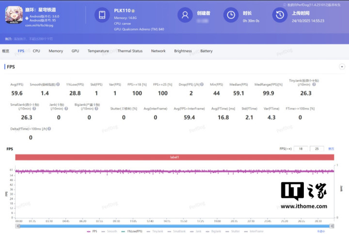 再来看《崩坏:星穹铁道》,时至今日这款游戏对于手机芯片的性能压力依旧是手游中最高的,经过30分钟「黄金的时刻」跑图测试,一加15的PerfDog(性能狗)游戏帧率曲线整体还是一条直线,游戏平均帧数为59.6帧。