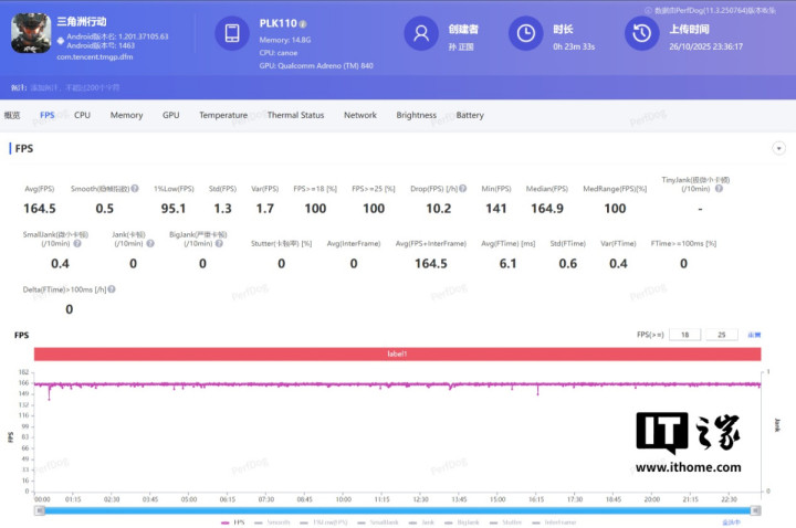 实测20分钟《三角洲行动》的游戏平均帧数164.5帧,Perfdog(性能狗)帧率曲线非常平稳,如此流畅的游戏体验让玩家在手机上也能够尽情享受“搜打撤”的乐趣。